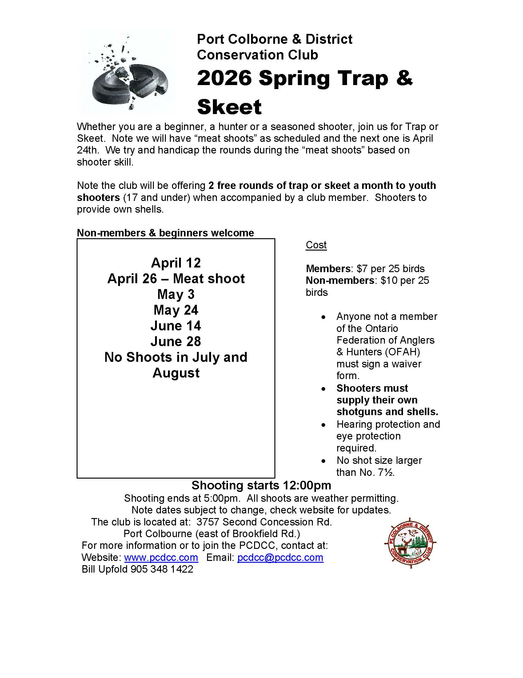 The Port Colborne & District Conservation Club was established in 1954. The Club’s objectives are to encourage and promote conservation of natural resources; teach wise use and responsible practices; uphold all fish & game regulations; promote and support scientific environmental research including the study of local marine and wildlife populations.